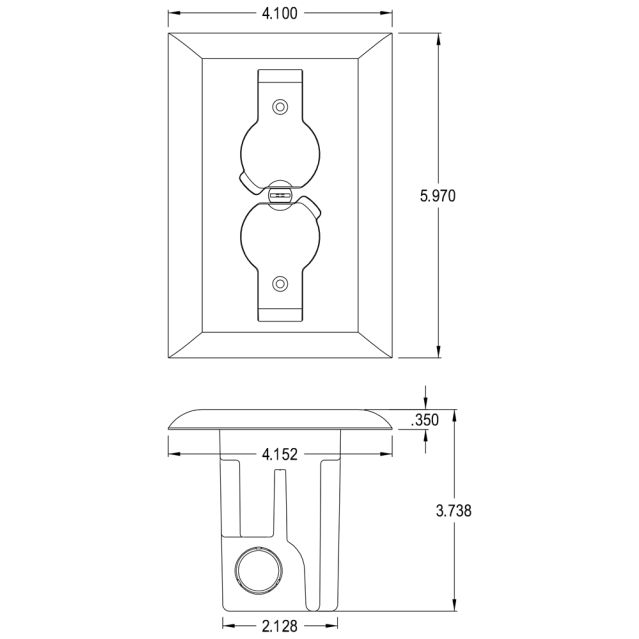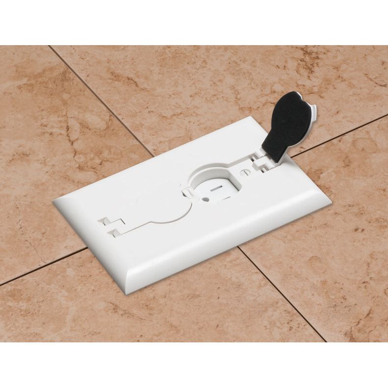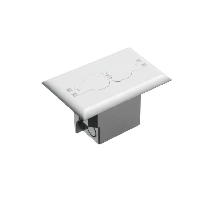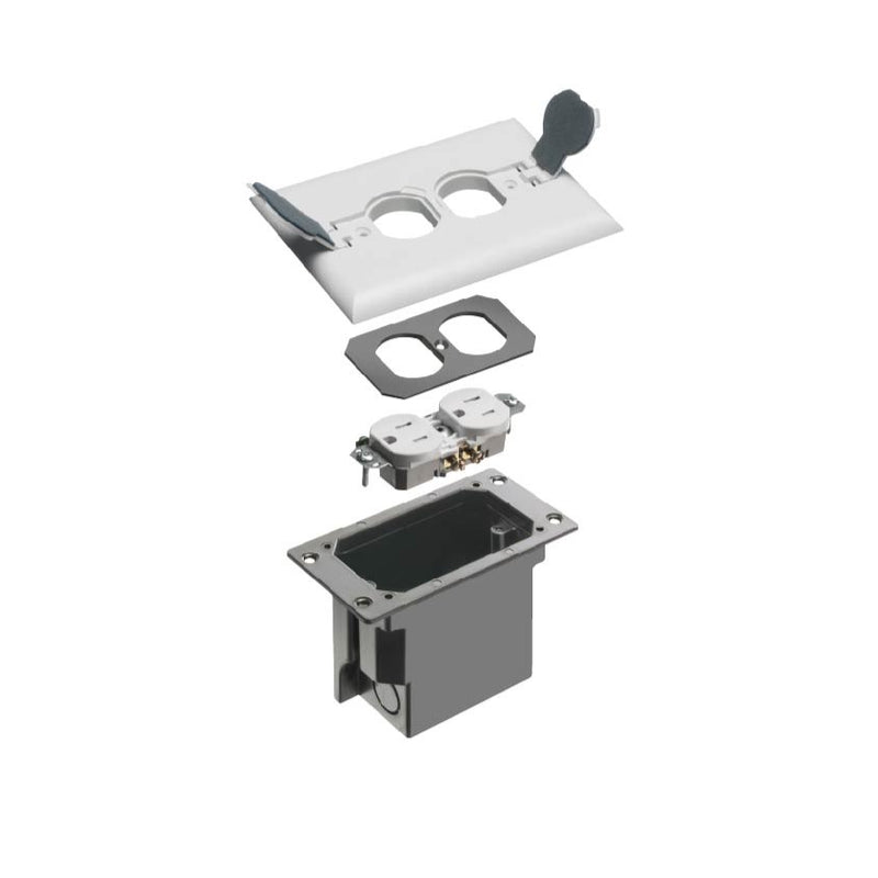 The Arlington FLBRF101W is a rectangular UL listed floor box outlet with a plastic white cover, it features a single duplex outlet that provides two power plugs. To access the plugs there are two lids that flip up so the user can plug in power. The kit includes the cover with threaded plugs, NM94 connector, gasket, back plate, 20 cubic inch plastic box, tamper-resistant duplex receptacle, and cover plate screws.