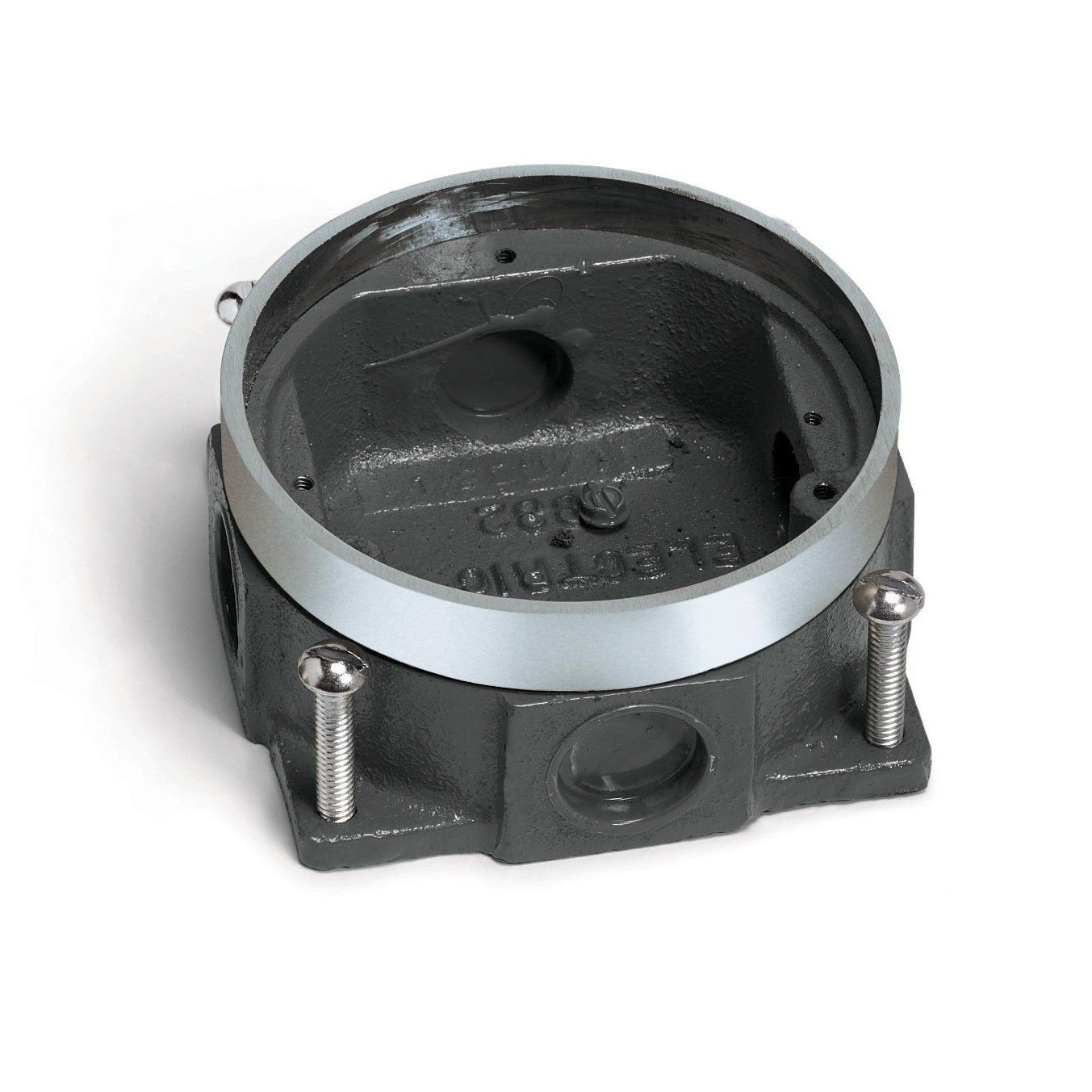 The Lew Electric 332-DA-A is a round die cast aluminum concrete floor box with an aluminum top flange. The box is semi-adjustable offering 1" of adjustability to be set to the level of the floor, post installation adjustability is not possible. The box is best suited for saw cut or core drilled installations, or pre-pour jobs that have 2 1/8" to 3 5/16" of concrete depth. There is 13 cubic inches of interior space available, the box is only 2" deep. There are four 3/4" knockouts on the sides of the box to run your wires to. The box ships with a protective cement cap to keep the box clean and safe during concrete pouring. The box does not ship with a cover, there are several options available that are sold separately, Lew 4" cover plates will fit flush. If the box is to be used in a carpeted area a sold separately carpet flange can be ordered, the SCF-1 series carpet flange adds 3/8" of height to accommodate the carpet and padding. For tile applications no flange is needed, simply pour your concrete to the level of the tile frame less the thickness of the tile. The box is ETL listed for UL 514A in the USA, and cUL listed C22.2 #18.1 and CSA approved for Canada installations.