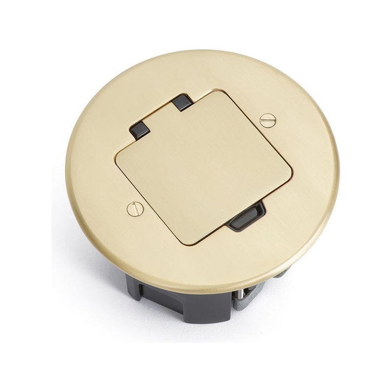 Single Receptacle Floor Box With Round Brass Cover, Flip Lid Opening