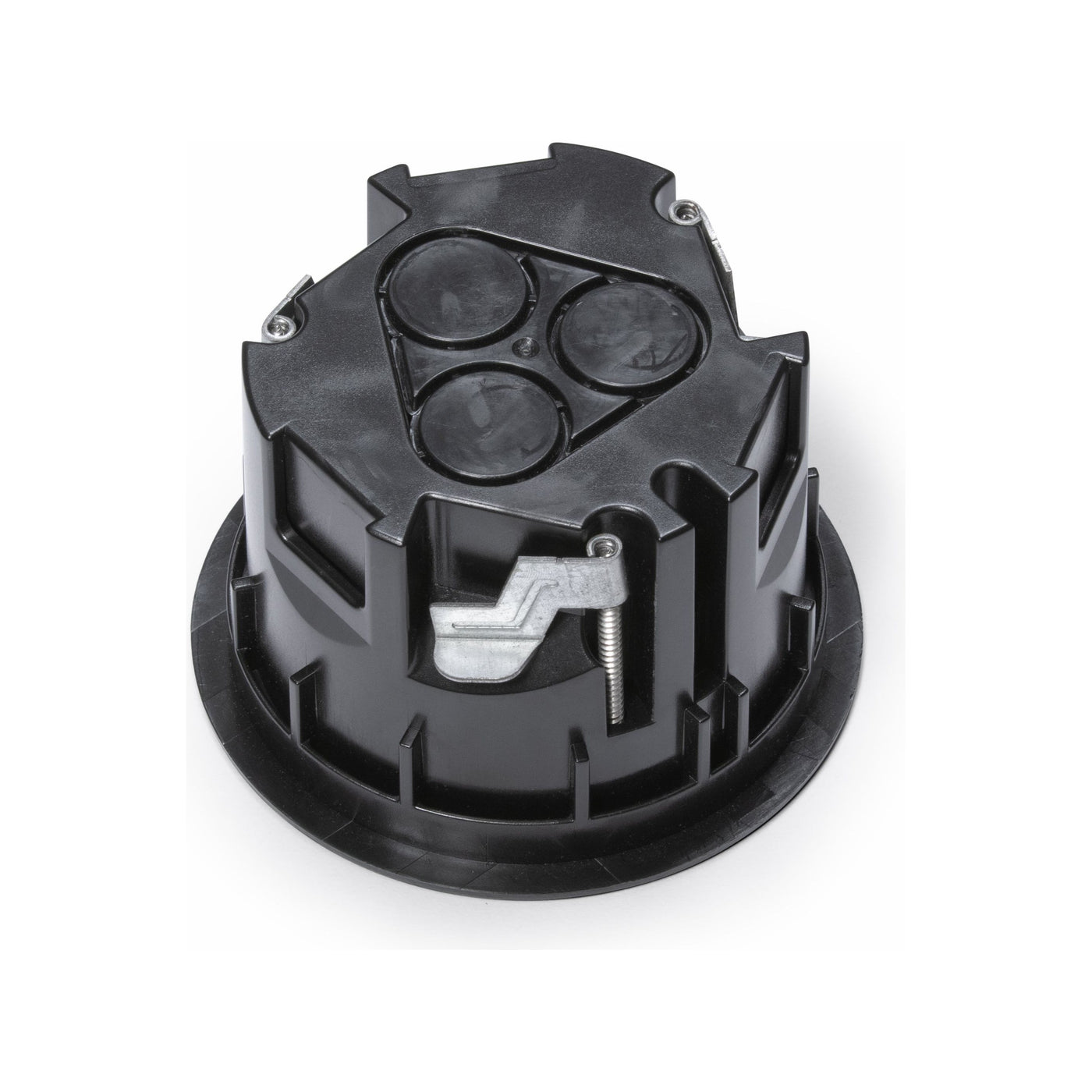 The plastic box is easy to install with a 3.5" hole saw in a finished floor, then drop in the box, tighten the two wing-nut screws from the top, wire the outlet, then installed the metal top with the supplied two screws. The bottom of the box has slots for NMB cable, as well as three 1/2" conduit openings.