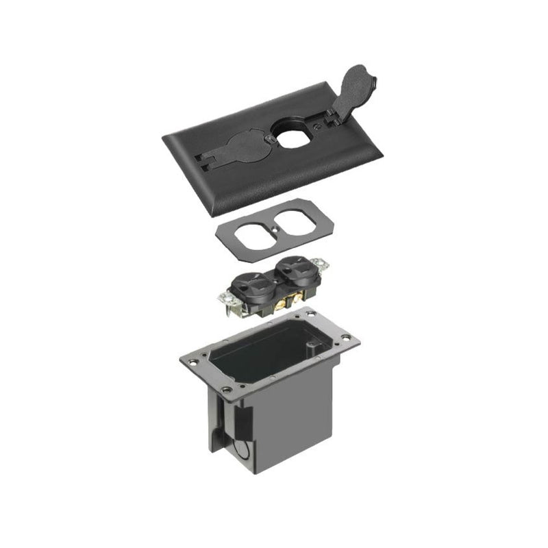The Arlington FLBRF101BL is a rectangular UL listed floor box outlet with a black cover, it features a single duplex outlet that provides two power plugs. To access the plugs there are two lids that flip up so the user can plug in power. The kit includes the cover with threaded plugs, NM94 connector, gasket, back plate, 20 cubic inch plastic box, tamper-resistant duplex receptacle, and cover plate screws.