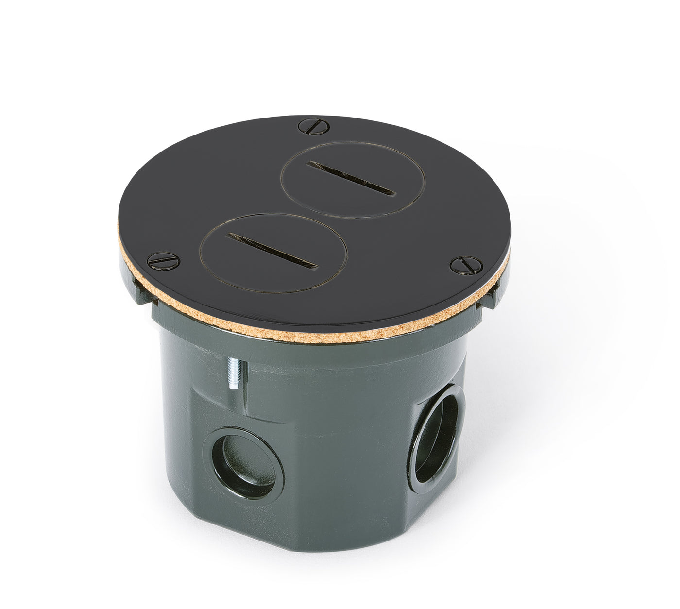 Flush Mounted Round Floor Box, One 15A Duplex, 2 Screw Plugs, Matte Black