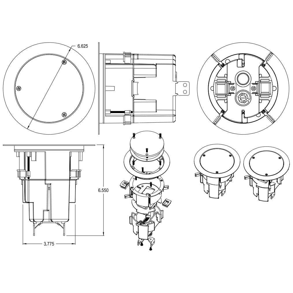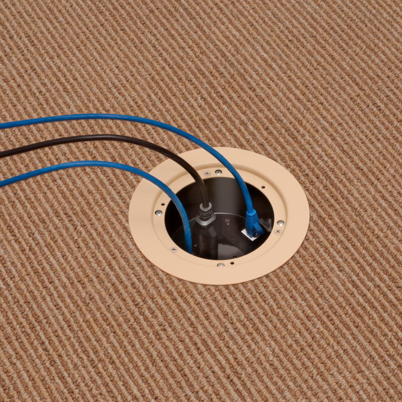 The Arlington FLBR5420LA is a round electrical floor box that features a duplex outlet, and 2 keystone openings. There is an integrated divider for the power and data so a divider doesn't need to be added. The 24.5 cubic inch back box is plastic and the cover is metal powder-coated in a durable light almond finish, there is a slot in the cover that allows cables to pass through with the cover installed. The power and low voltage connections are recessed in the box so the plugs remain low in the box, only the cables will stick out. The cover size is 6.625", and the depth of the box is 6.55". The top cover is incredibly thin at only .067" thick.