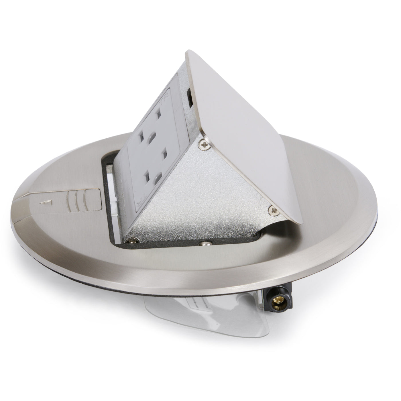 The Lew Electric PUFP-SD is an indoor floor box that provides duplex power in a hidden and attractive pop up. When closed the pop up is hidden in your floor, all you see is a stylish round stainless steel top. When you push the slide button the top tilts open revealing the power outlet. The outlet is 15 amps with tamper resistant plugs, and is UL listed. This pop up is perfect for any locations where you need hidden power, or locations where a wall out is not available. The unit as a whole is UL listed, it is also cUL recognized for Canadian installations. In the closed position the top is UL compliant to keep out dust and scrub water.