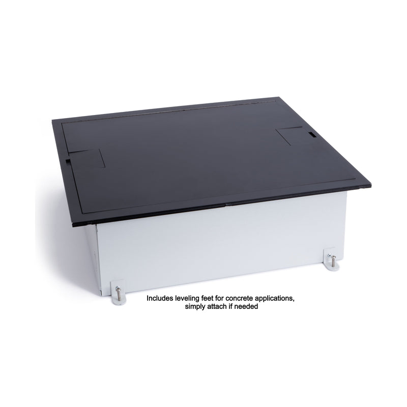The stage pocket floor box is a perfect choice for any raised access floor, wood floor, or even concrete. Install in a raised access floor, screw into a wood surface, or set into concrete. For concrete there are 4 leveling feet included that attach to each corner of the box, there is also a construction cover to keep the box clean during construction. The floor box ships with the back box, cover, leveling feet, construction cover, blank plates for any unused spots, and screws to attach the cover to the box. The galvanized steel back box is 15" x 15" and 5" deep. The cover is 17 1/2" x 16" and .27" thick. There are six 1/2" or 3/4" knockouts, and six 3/4" or 1" knockouts for power and/or data connectivity.