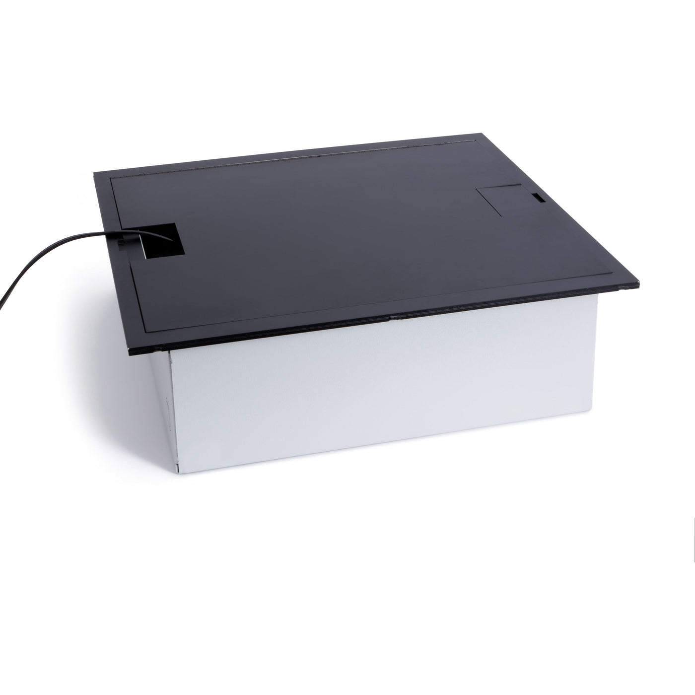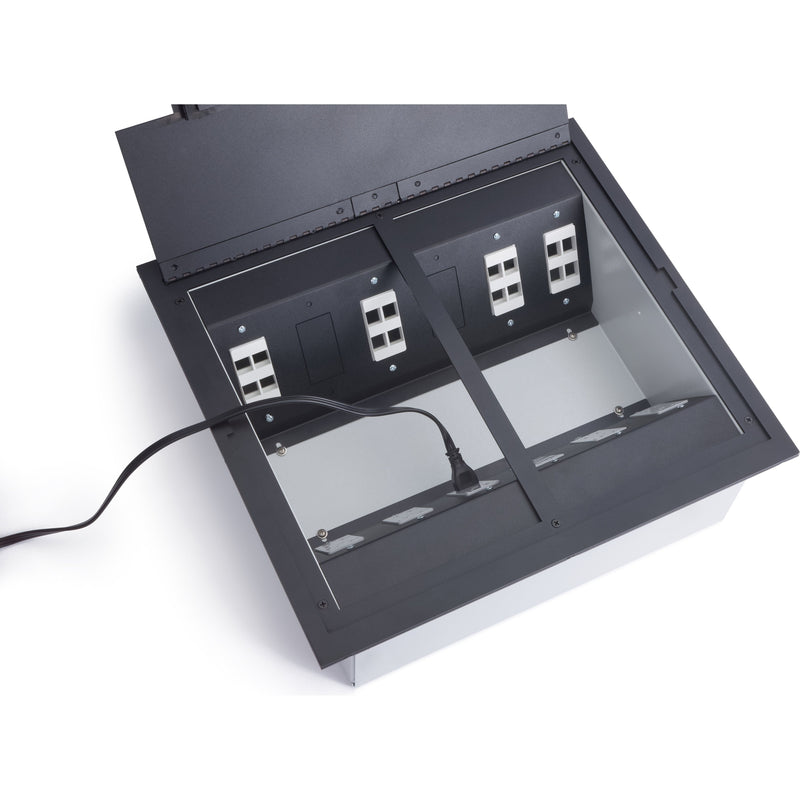 The Lew Electric 12200-SS is a versatile floor box that can be installed in a raised access floor, wood floor, or concrete. Inside the box you will find 6 decora openings on each side for a total of 12, the box has a built-in divider for power and data. The steel lid is an attractive and durable stainless steel with a hinged lid opening, as well two small hinged lid openings for cable pass-through. There is a rubber gasket around the inside perimeter of the cover to help keep liquids out. The black pictures are for reference only, you will receive the stainless steel model that you see in the first image.