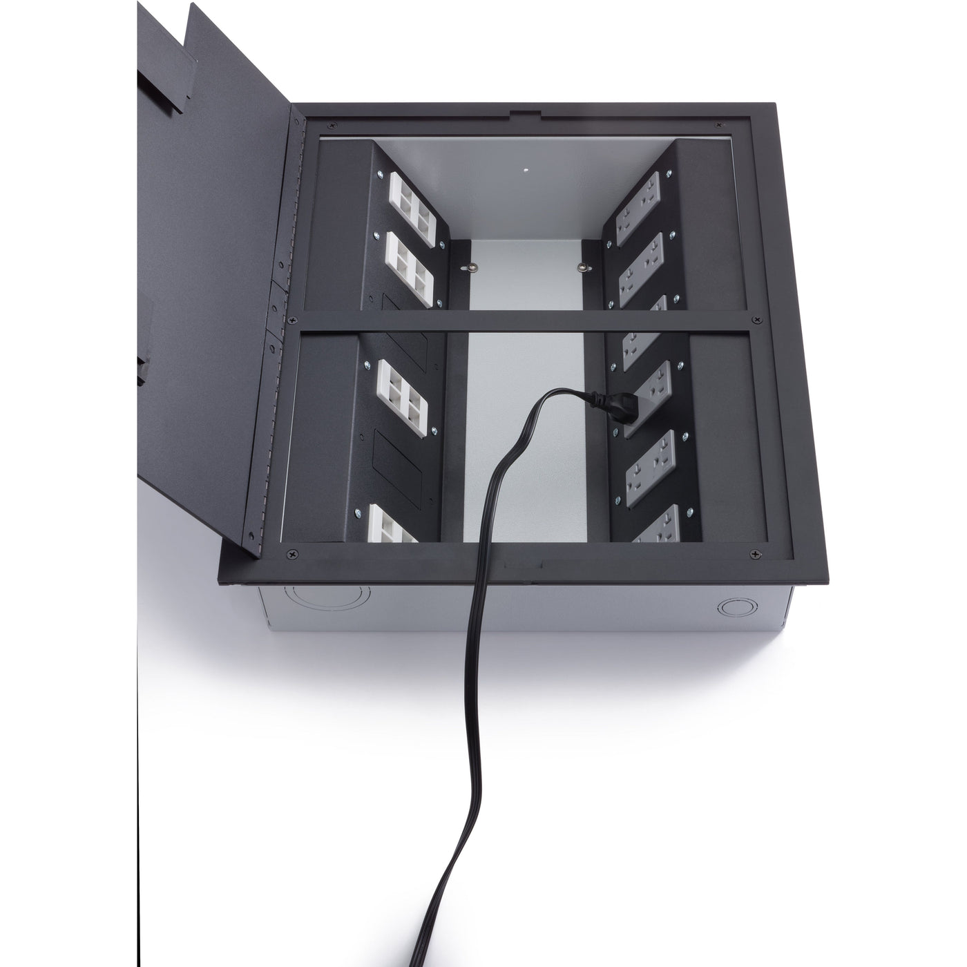 Inside the floor box, you will find 12 decora openings to add in your power or data connections. (Outlet and data plates in pictures not included)
