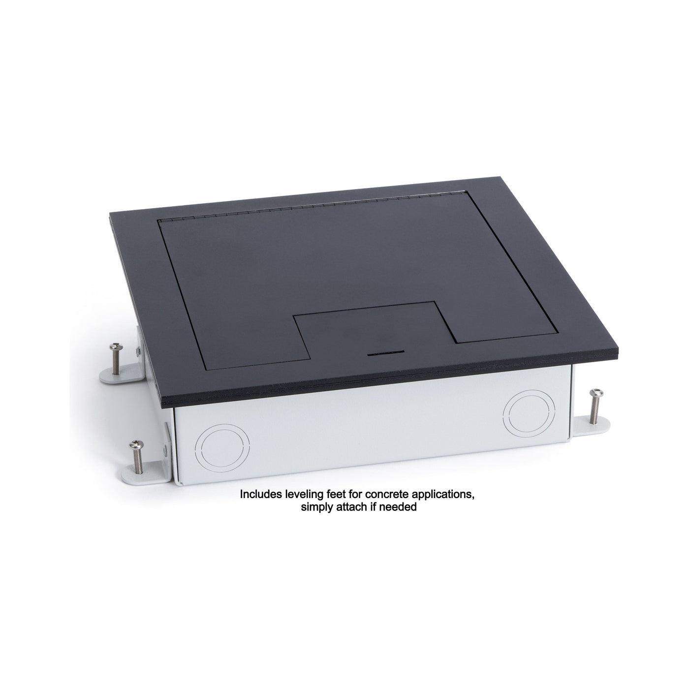 The stage pocket floor box is a perfect choice for any raised access floor, wood floor, or even concrete. Install in a raised access floor, screw into a wood surface, or set into concrete. For concrete there are 4 leveling feet included that attach to each corner of the box, there is also a construction cover to keep the box clean during construction. The floor box ships with the back box, cover, leveling feet, construction cover, blank plates for any unused spots, and screws to attach the cover to the box. The galvanized steel back box is 8 3/4" x 6" and 2.75" deep, and the cover size is 9 1/4" x 9 1/4" and .27" thick. There are eight 1/2" knockouts for power and/or data connectivity.