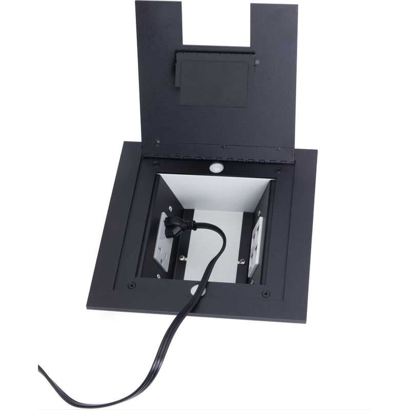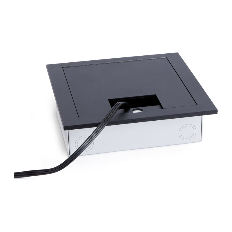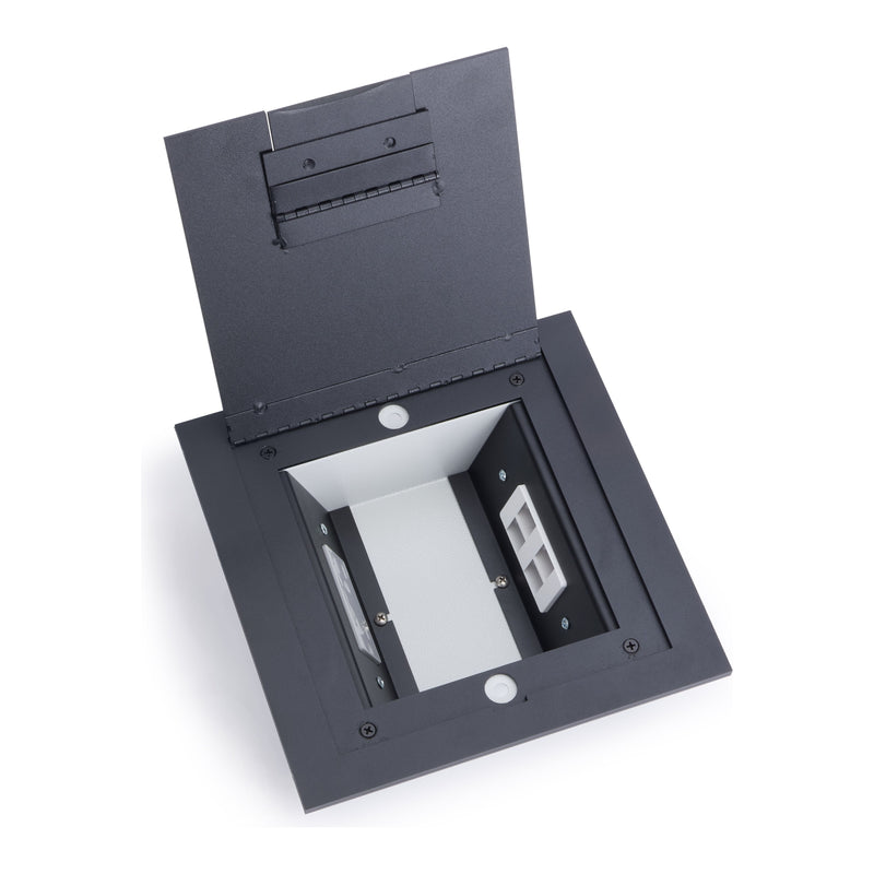 The Lew Electric 2200-SS is a versatile floor box that can be installed in a raised access floor, wood floor, or concrete. Inside the box you will find a decora opening on each side, the box has a built-in divider for power and data. The steel lid is an attractive and durable real stainless steel with a hinged lid opening, as well as a small hinged lid opening for cable pass-through. There is a rubber gasket around the inside perimeter of the cover to help keep liquids out. We are showing the black images for reference, this will ship as stainless steel that you see in the first picture.
