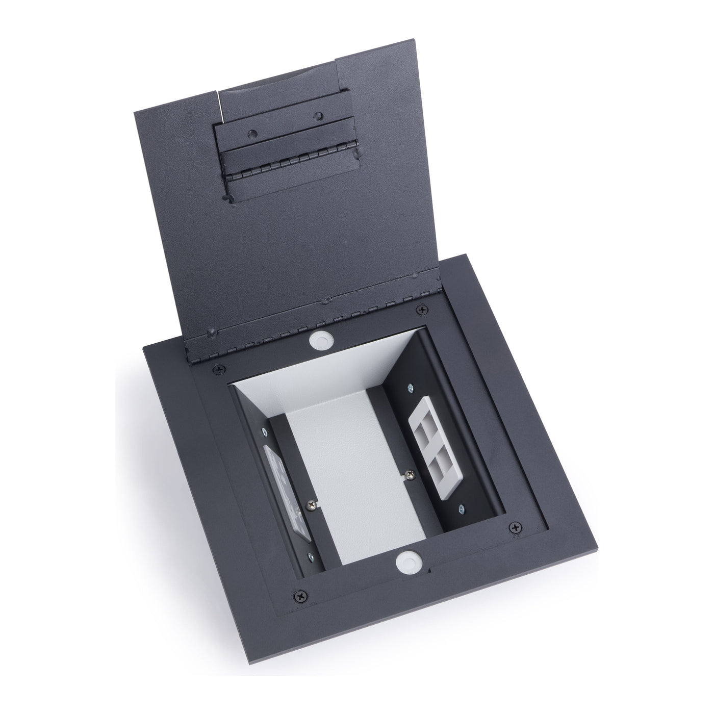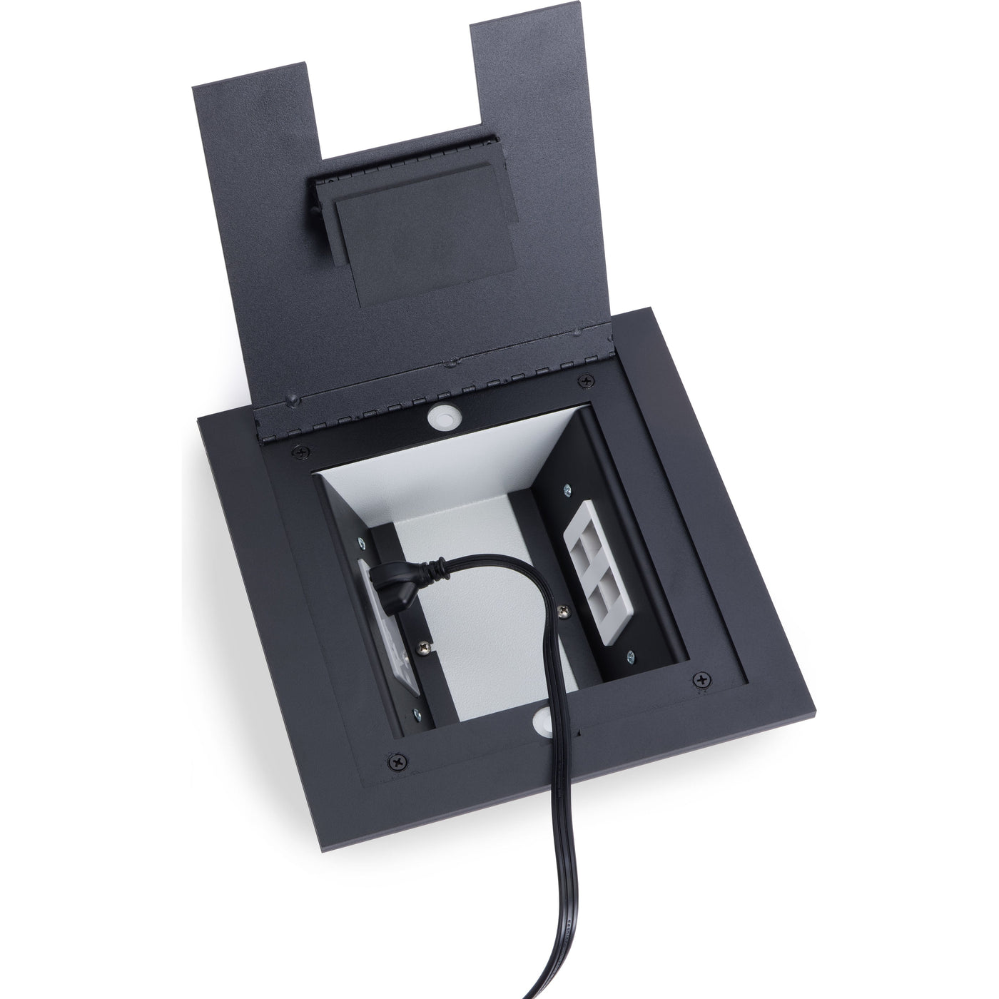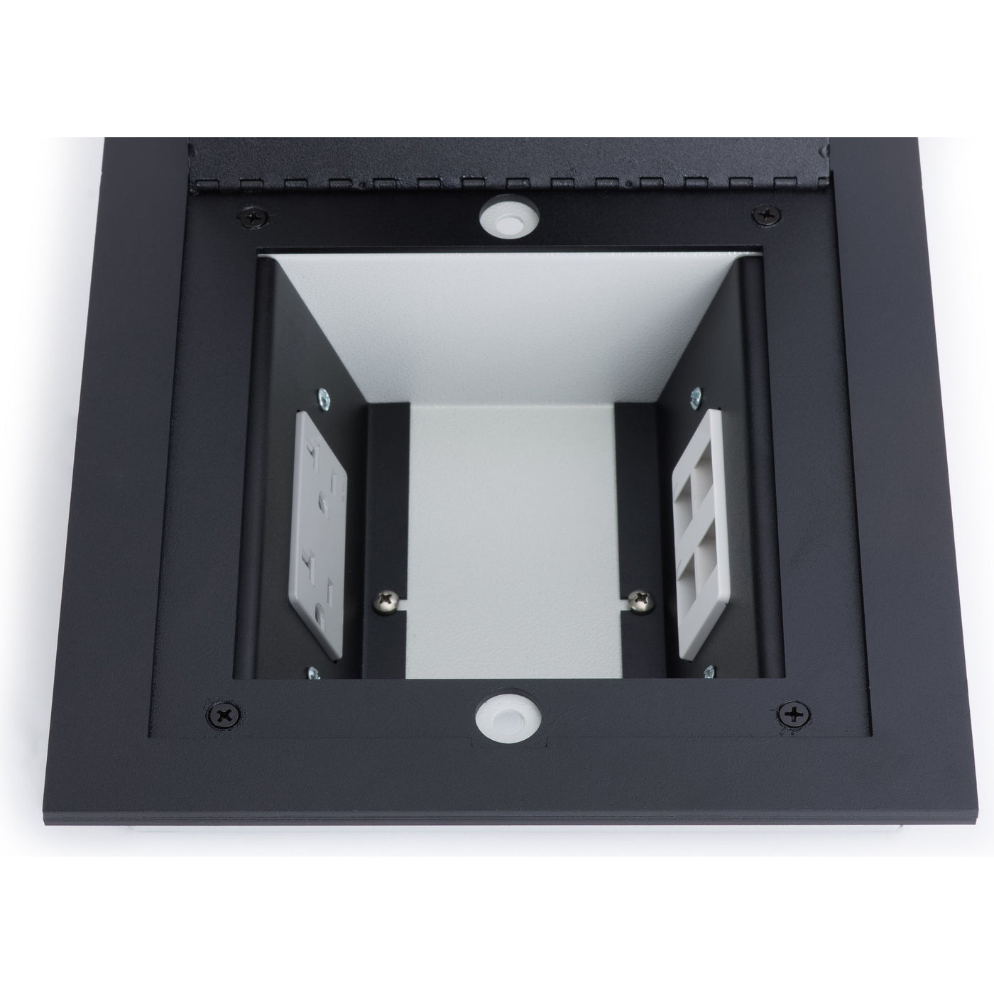 Inside the floor box, you will find 2 decora openings to add in your power or data connections. (Outlet and data plates in pictures not included)