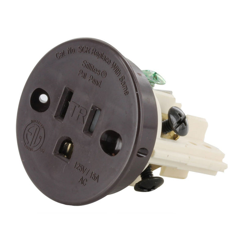 The Sillites SCRBR is a 2" round self-contained receptacle in brown color, install it in window sills, mantels, kitchen islands, baseboards, or any cabinet. The outlet mounts nearly flush with any surface creating a clean unobtrusive look. The receptacle includes a matching cover, the cover is paintable to blend into the surface behind it. The sockets are 15 Amps with tamper-resistant plugs.