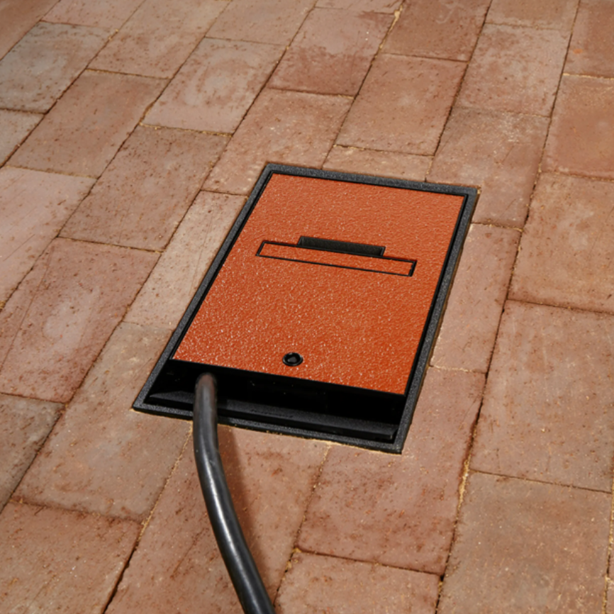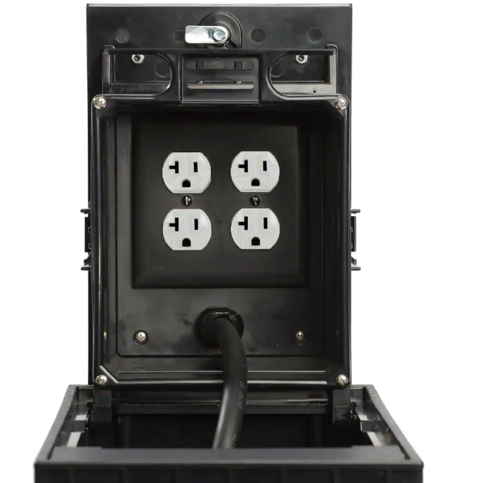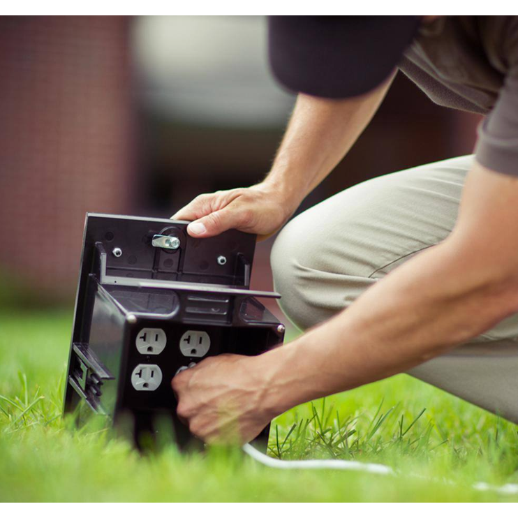 The box blends in perfectly with any outdoor space including grass, mulch, concrete, brick, pavers, dirt, walkways, patios, and more. Install in any outdoor location that requires safe power including shopping centers, campuses, amusement parks, sports fields, transit, and hospitality locations. The built-in cable guides organize cables and line them up with the smart egress doors that auto adjust to allow for easy management of cables exiting out. The egress door also auto closes and locks when no cables are exiting the box.